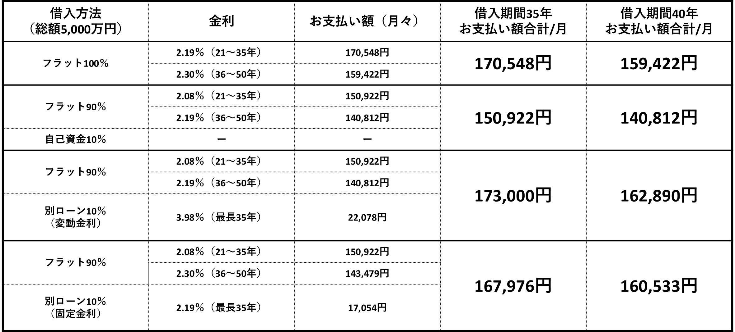 フラットは、ローンの組み合わせ(借入方法)と実際のお支払いを比較すると具体的に検討することができます。下記は、建築・購入費用5,000万円と仮定した場合の借入方法と支払金額について比較しています。